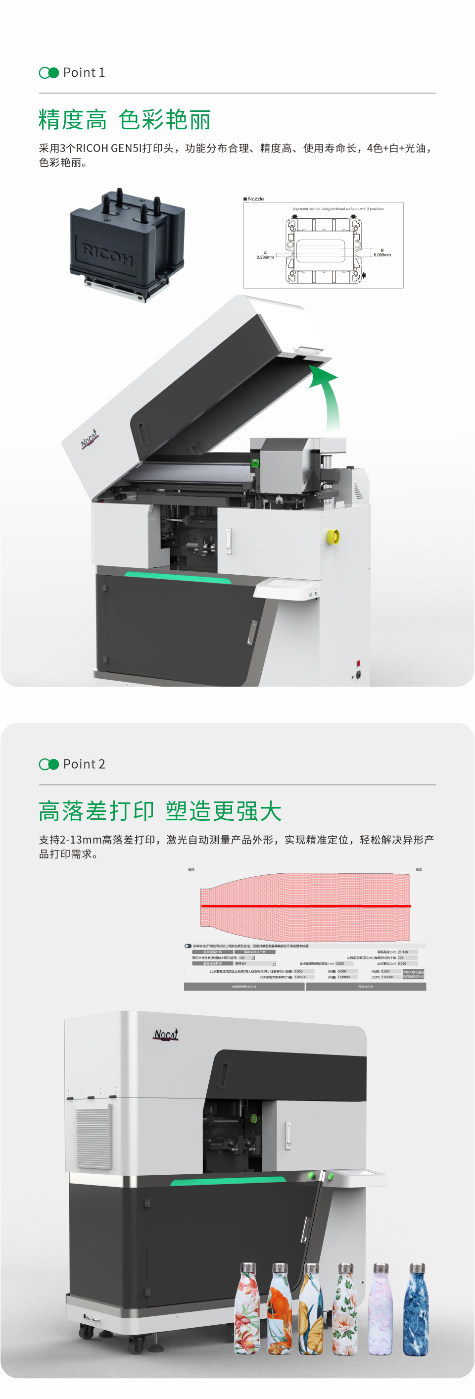 支持2-13毫米高落差打印,激光自動測量產(chǎn)品外形,實現(xiàn)精準定位,輕松完美打印異形產(chǎn)品。