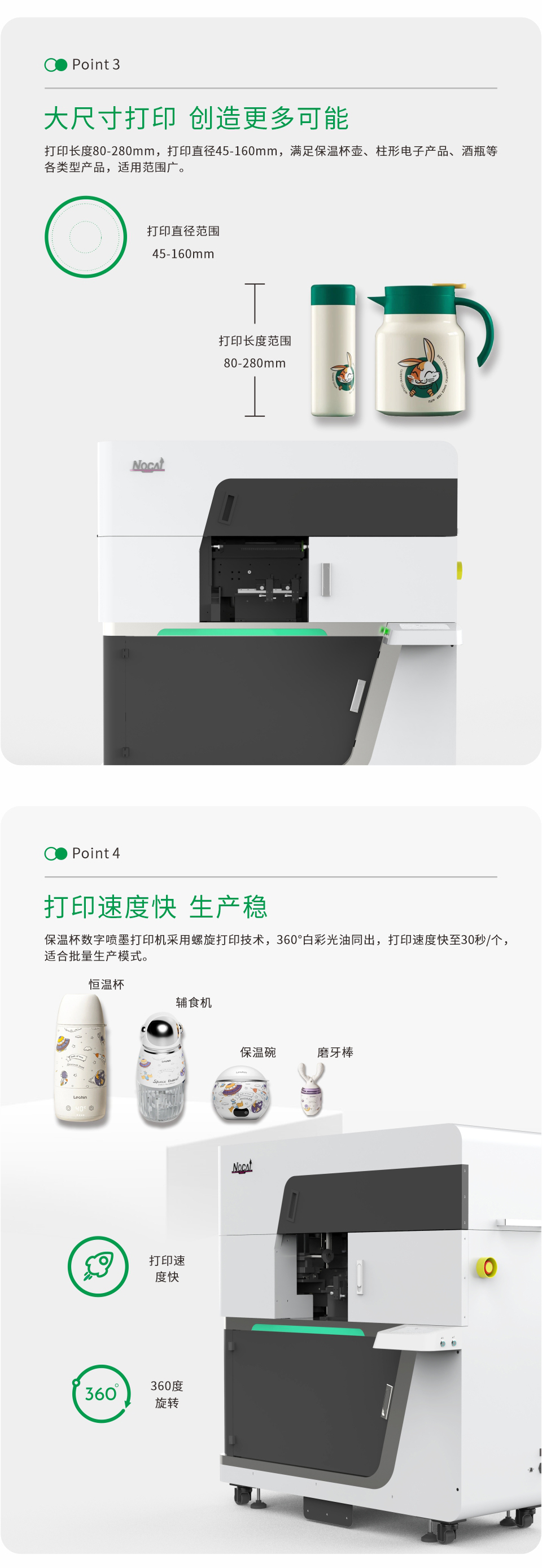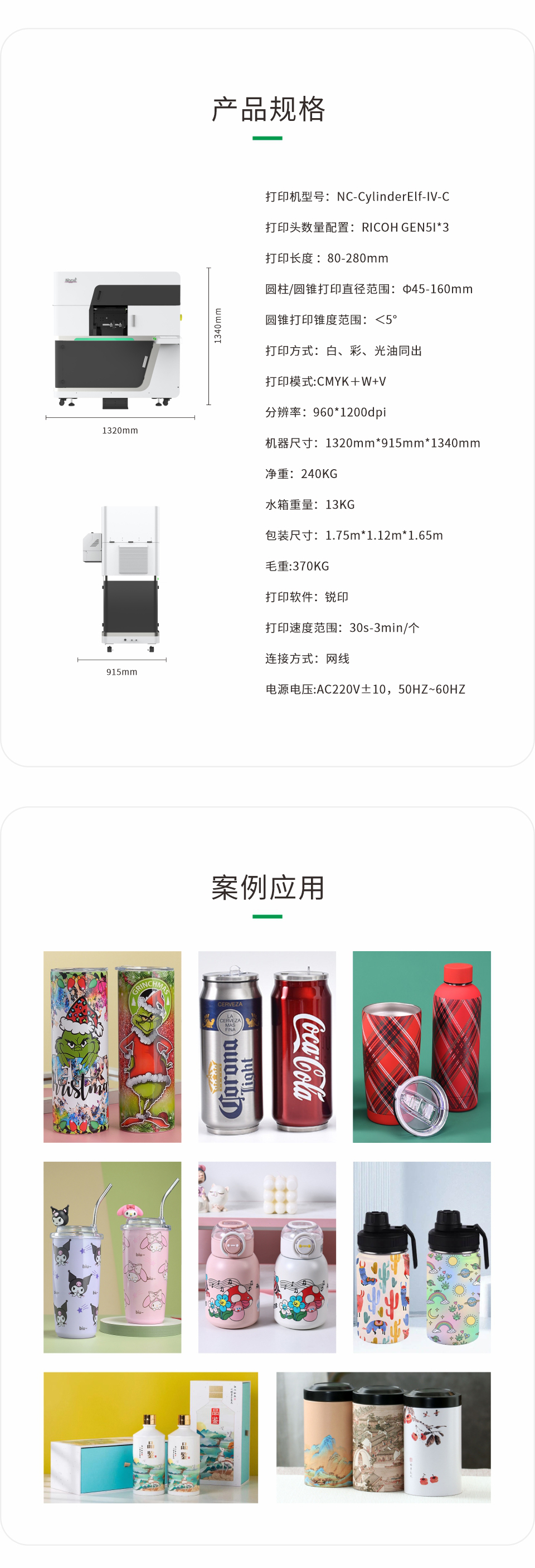 打印長度80-280mm,打印直徑45-160mm,滿足保溫杯壺、柱形電子產(chǎn)品、酒瓶等各類型產(chǎn)品,適用范圍廣。