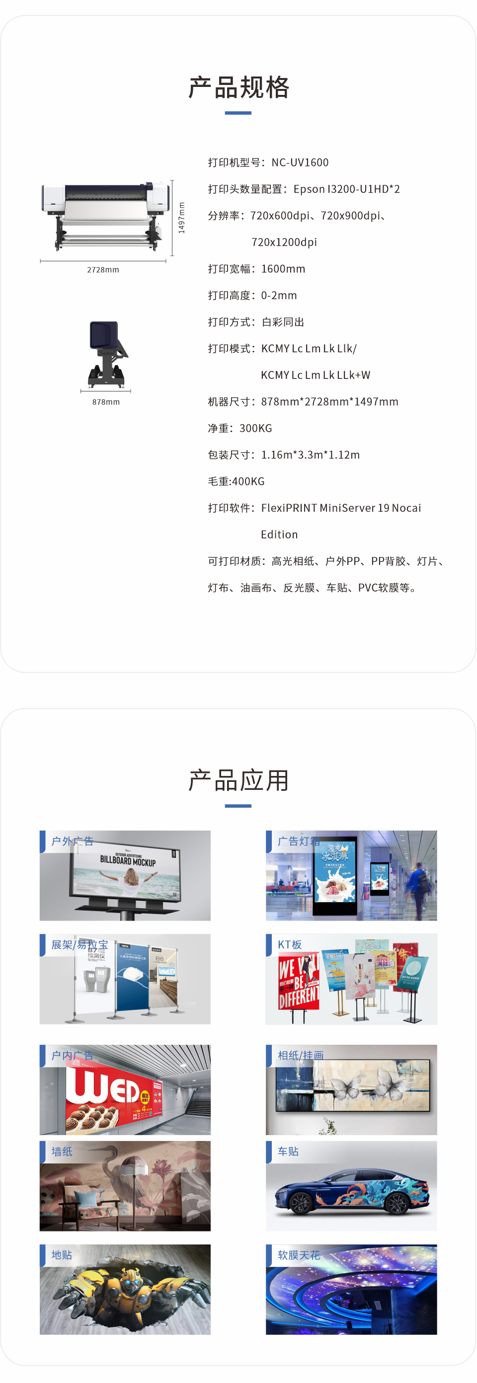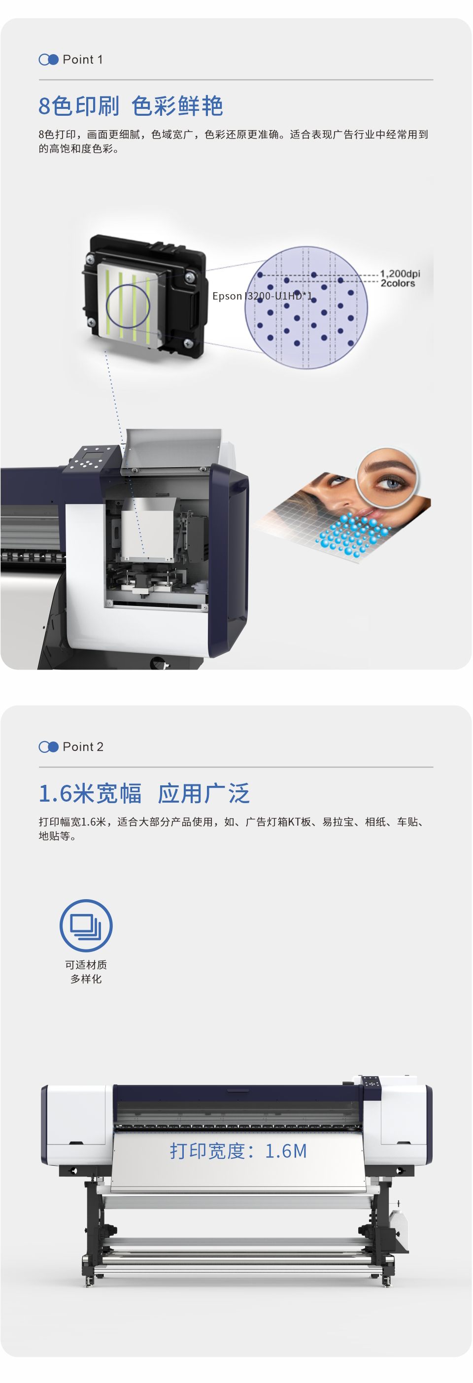 打印幅寬1.6米,適合大部分產(chǎn)品使用,如、廣告燈箱KT板、易拉寶、相紙、車貼、地貼等。