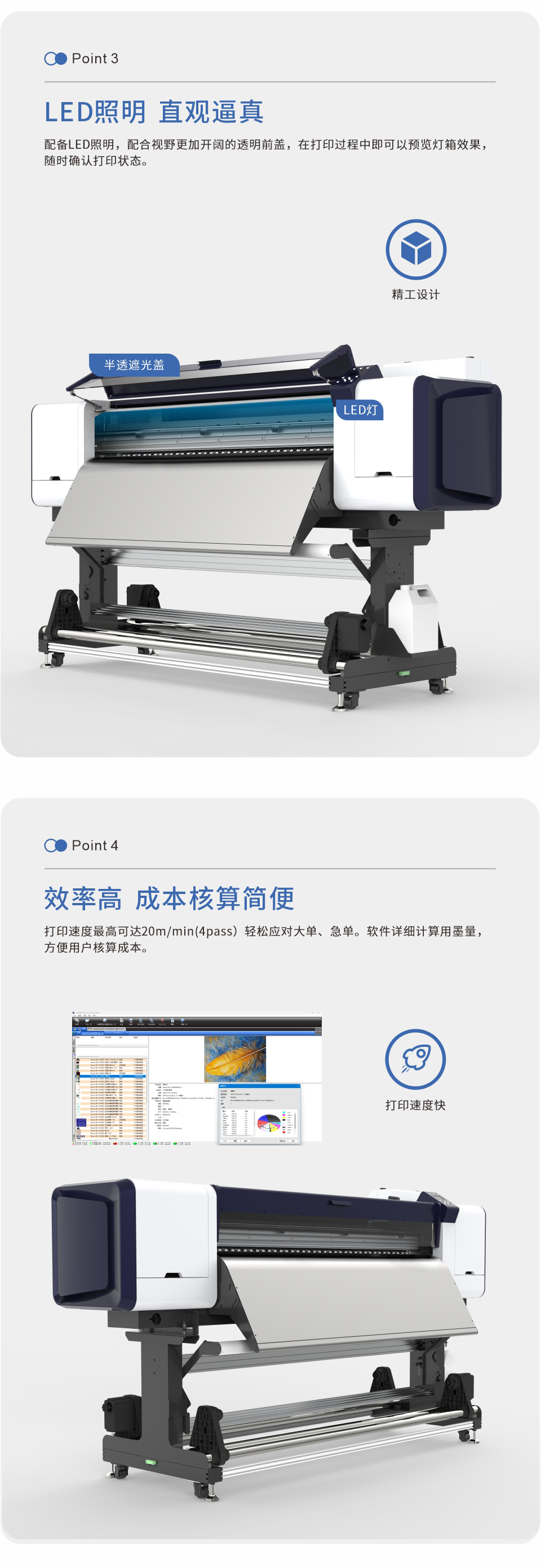 打印速度快,輕松應(yīng)對(duì)大單、急單。軟件詳細(xì)計(jì)算用墨量,方便用戶核算成本。