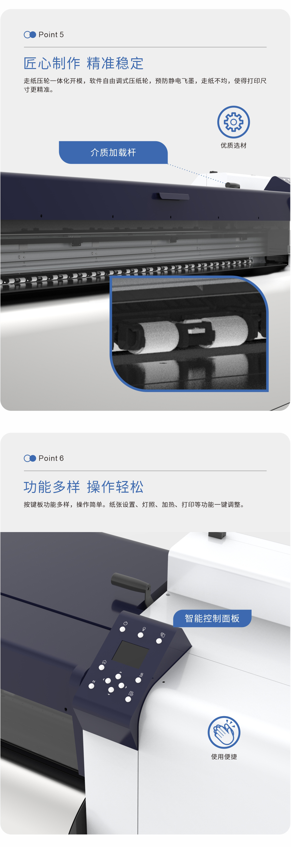 走紙壓輪一體化開模,軟件自由調(diào)式壓紙輪,預(yù)防靜電飛墨或走紙不均的問題,使得打印尺寸更精準(zhǔn)。