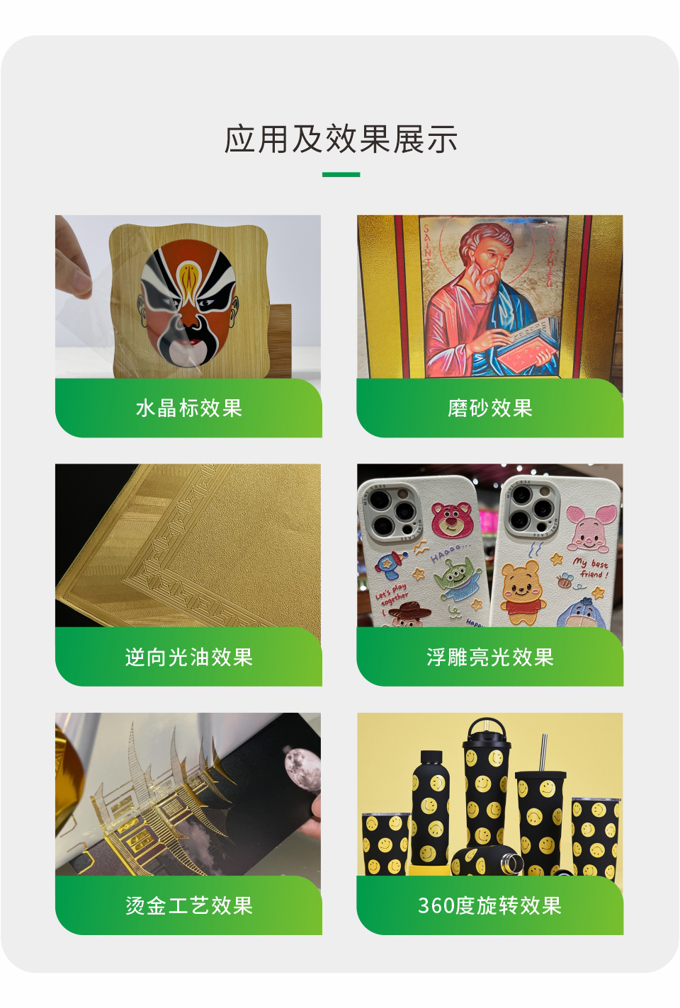 效果多樣化,可實(shí)現(xiàn)白彩光油、水晶標(biāo)、逆向光油、燙金等效果。