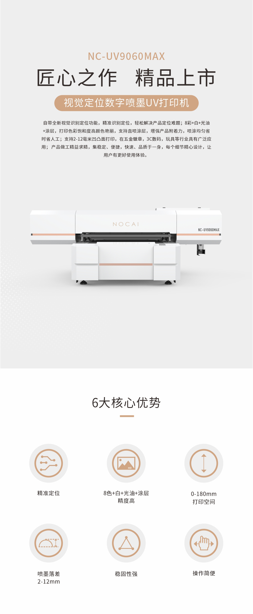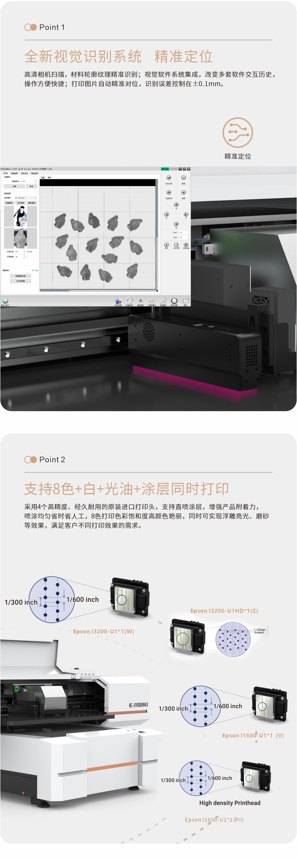 采用4個(gè)高精度、經(jīng)久耐用的原裝進(jìn)口打印頭,支持直噴涂層,增強(qiáng)產(chǎn)品附著力,噴涂均勻省時(shí)省人工,8色打印色彩飽和度高顏色艷麗,同時(shí)可實(shí)現(xiàn)浮雕亮光、磨砂等效果,滿(mǎn)足客戶(hù)不同打印效果的需求。