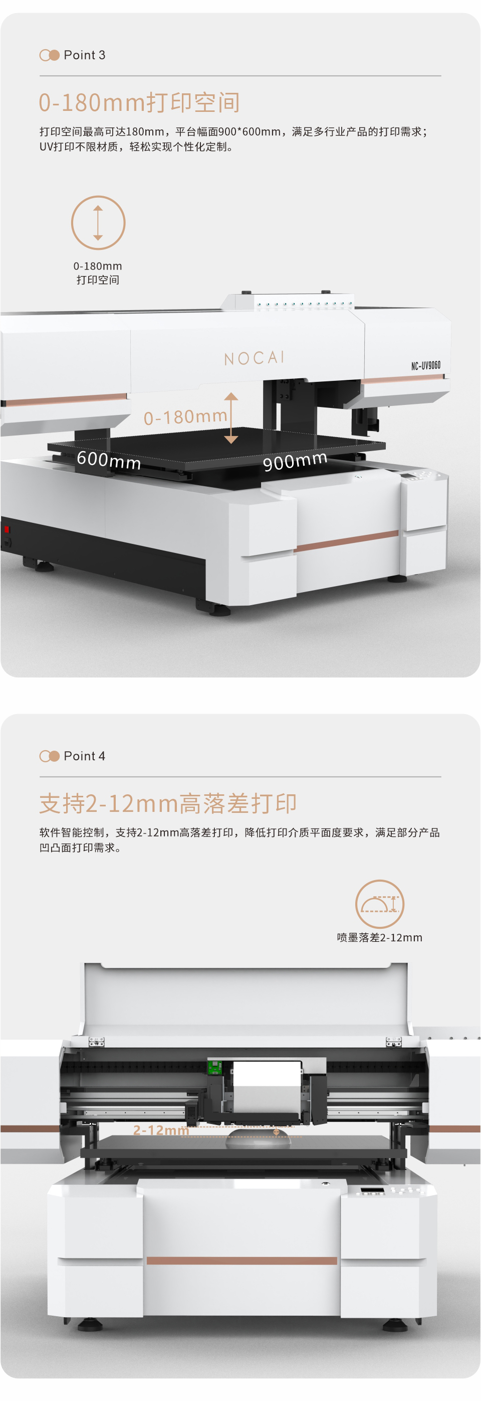 軟件智能控制,支持2-8mm高落差打印,降低打印介質(zhì)平面度要求,滿(mǎn)足部分產(chǎn)品凹凸面打印需求。