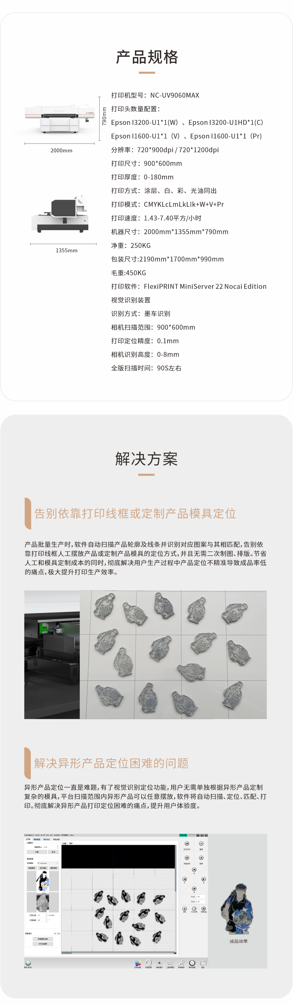 高清相機(jī)掃描,材料輪廓紋理精準(zhǔn)識(shí)別;視覺(jué)軟件系統(tǒng)集成,改變多套軟件交互歷史,操作方便快捷;打印圖片自動(dòng)精準(zhǔn)對(duì)位,識(shí)別誤差控制在±0.1mm。